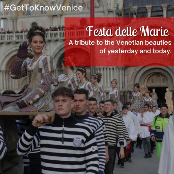 - Festa delle Marie: since 9th century, every year, a collective wedding ceremony of 12 girls, among the poorest and most beautiful, was celebrated in the church of San Pietro di Castello. In 946 a group of Dalmatian pirates broke into the church and kidnapped the girls. Nowadays, during Carnival, a great procession takes place, in which 12 Venetian girls parade from San Pietro di Castello up to San Marco square to celebrate the victory on the pirates.
