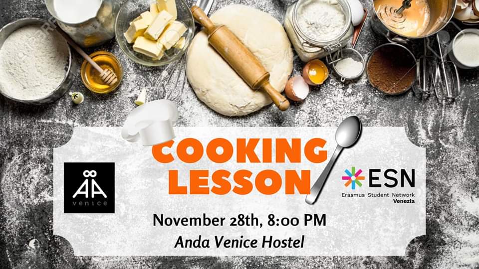 ESN Venice, in collaboration with Anda Venice Hostel, invites you to the most amazing Cooking Lesson ever! A chef will teach you how to cook an Italian first dish and to prepare a paired drink! Once prepared, you'll enjoy the dishes and your drinks all together with great music!